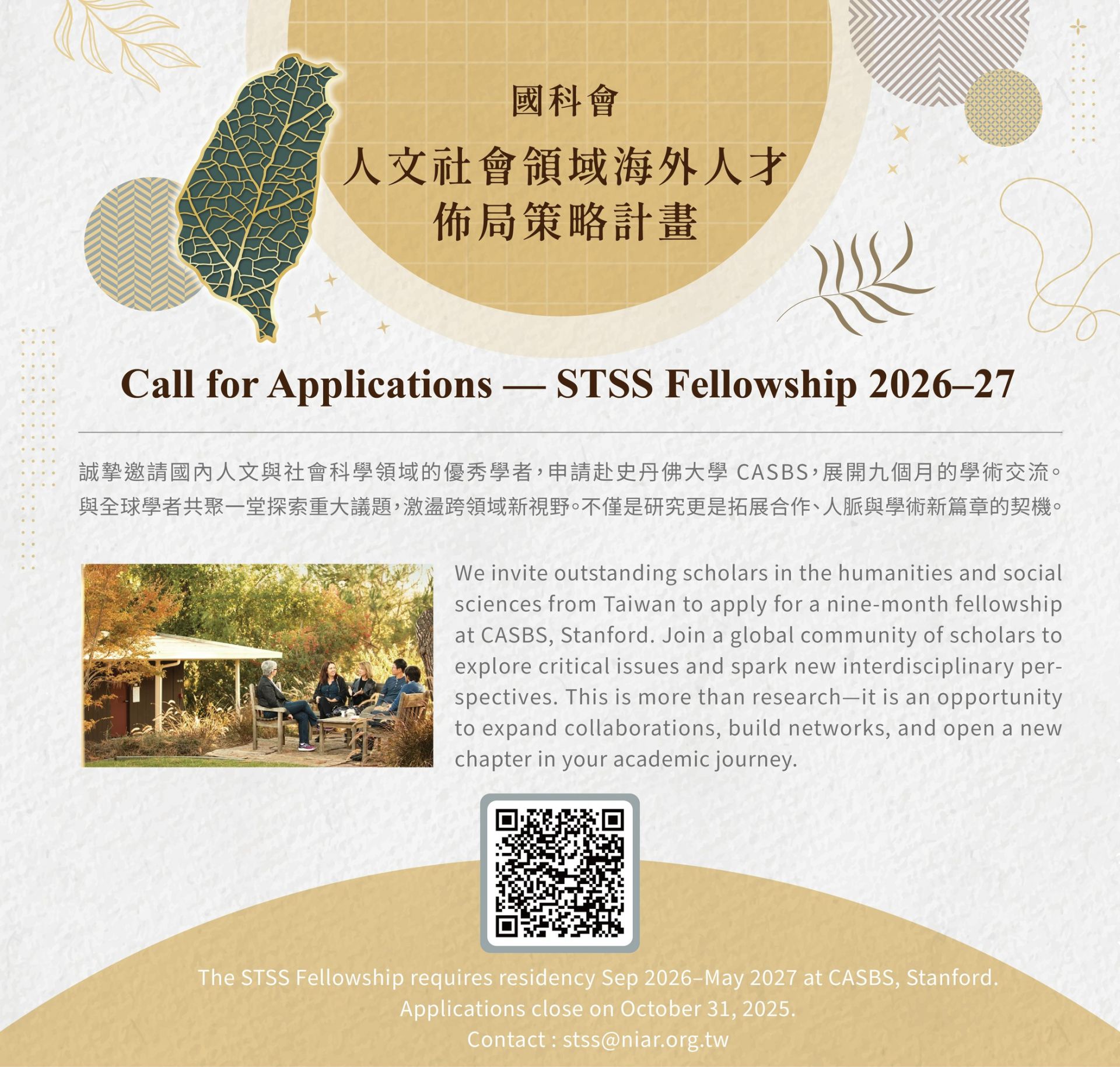 一、為促進國內人文社會科學領域研究之卓越化,國家科學與技術委員會「人文社會領域海外人才佈局策略計畫」設置 Stanford-Taiwan Social Science Fellowship (簡稱 STSS),透過與美國史丹佛大學行為科學高等研究中心 (Center for Advanced Study in the Behavioral Sciences,簡稱 CASBS)合作,甄選人社領域傑出人才赴該機構進行研究交流,進一步提升國內人文社會科學高階學術研究人才,促進與 CASBS研究社群之跨領域交流合作。
