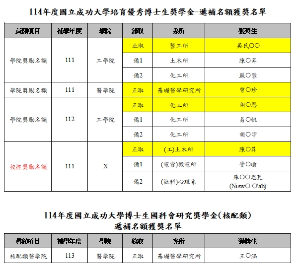 1. 114學年度舊生: 111、112學年度培育優秀博士生獎學金遞補名單+113年9月入學之國科會博士生研究獎學金核配類遞補 名名單如下。 2. 新年度獎學金請領(114.09.01-115.08.31)相關事宜請待後續信件通知。 3. 依據本校「國立成功大學培育優秀博士生獎學金試辦要點」第十點,重新遞補同一學年入學之博士生,且 遞補博士生僅能接續該名額剩餘的年度獎學金。 依據本校「國立成功大學博士生國科會研究獎學金試辦要點」第八點辦理遞補,獎勵期間以原獲獎博士生 剩餘獎勵期間為限。(惟依據當時國科會補助要點此獎勵名額僅補助到博士班三年級)。