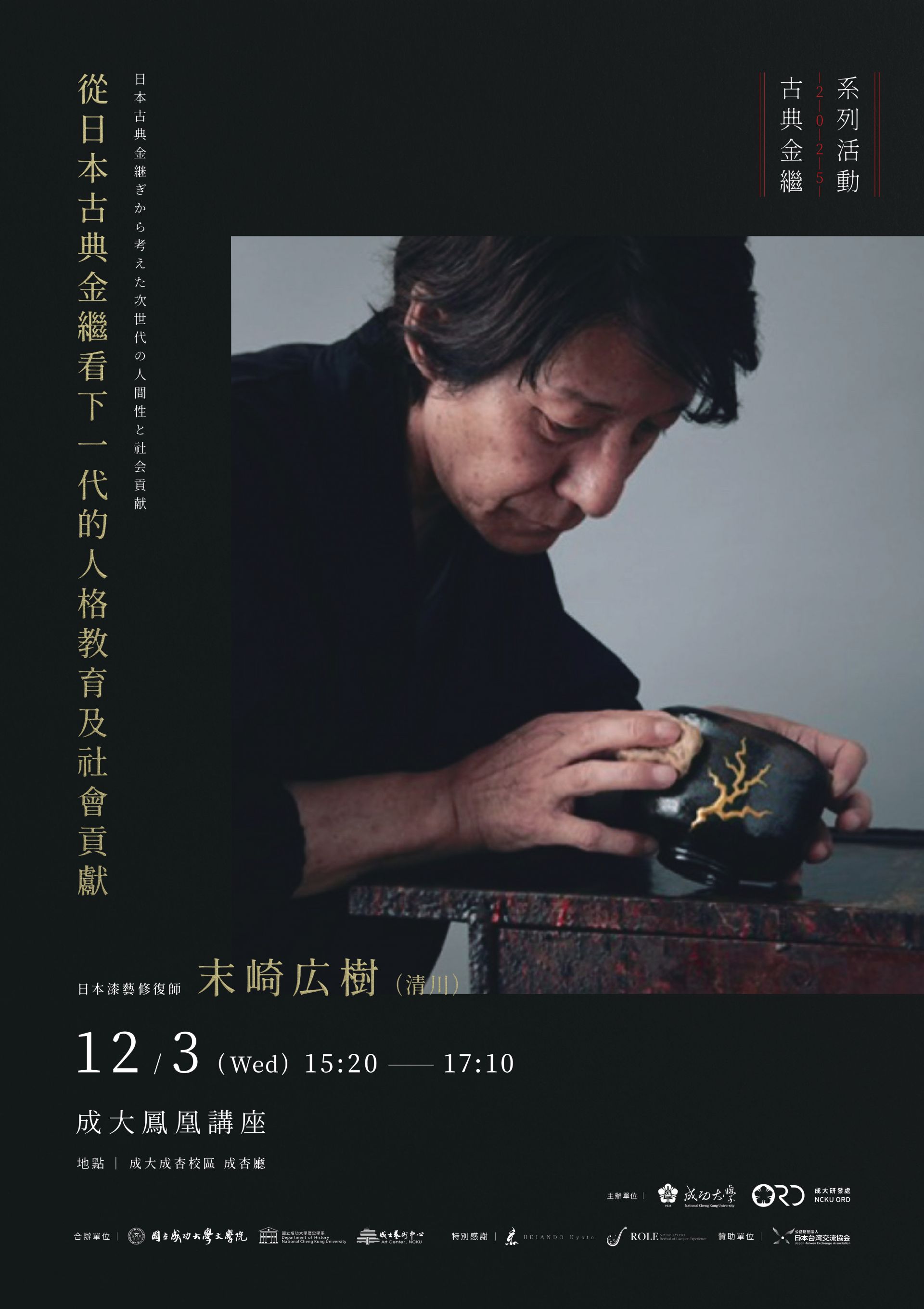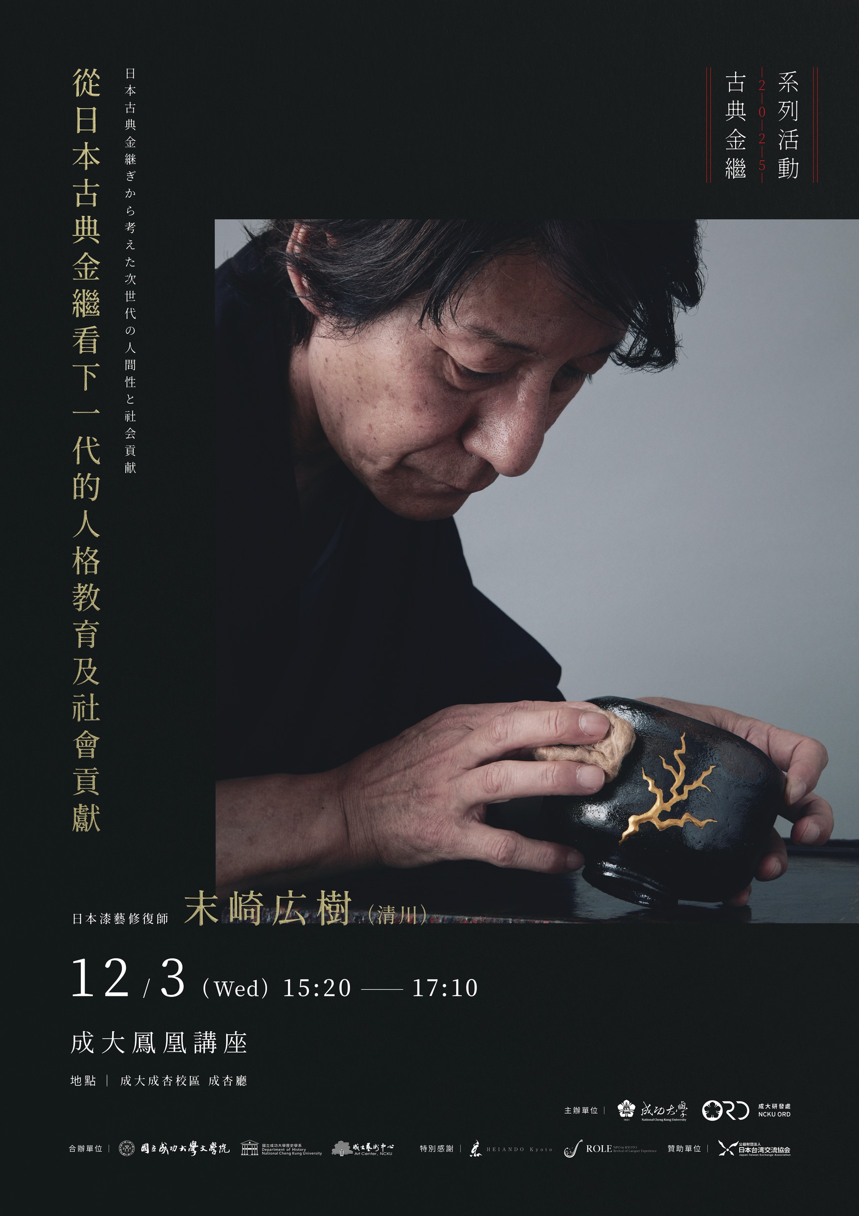 ==================================演講資訊================================== 【主 講 者】株式會社漆藝舎末崎広樹社長 (日本漆藝修復師) 【講座專題】從日本古典金繼看下一代的人格教育及社會貢獻 【講座時間】114年12月3日(三)15:20 (14:50開放入場) 【演講地點】成杏廳 (國立成功大學成杏校區醫學院1F) 【報名網址】https://activity.ncku.edu.tw/index.php?c=apply&no=16787 ==================================演講資訊==================================