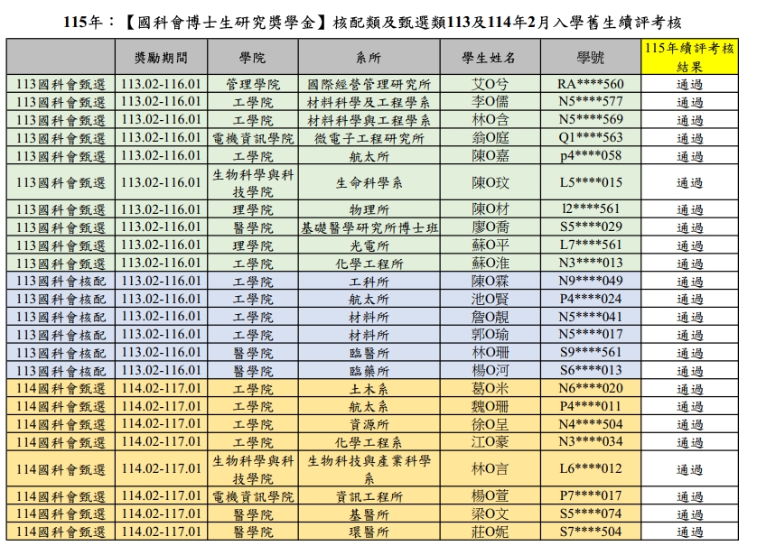 1. 113及114年度2月入學舊生(國科會甄選&核配類獲獎生)續領獲獎名單如附件,恭喜通過續評考核同學,新年度獎學金請領(115.02.01-116.01.31)相關事宜請待後續通知。 **名單僅顯示通過續領考核之同學名冊,無通過考核或其他自願放棄資格之名單無揭露**2. 有關113年2月入學國科會核配類遞補缺額: 遞補學年度 學院 員額項目 名額 剩餘獲獎年限 113 工學院 國科會核配類 1 115.02.01-116.01.31 ● 依據本校「國立成功大學博士生國科會研究獎學金試辦要點」第八點辦理遞補,獎勵期間以原獲獎博士生剩餘獎勵期間為限。 ● 此缺額優先以同入學年生申請(113年2月入學),依據當時國科會補助要點此獎勵名額僅補助到博士班三年級止。(如有申請缺額,視情況開放其他年級申請) 3. 本次缺額遞補申請作業自即日起受理申請至3/13(五),詳細申請作業期程和收件方式、申請書格式及其他補充資料請依各學院要求辦理。